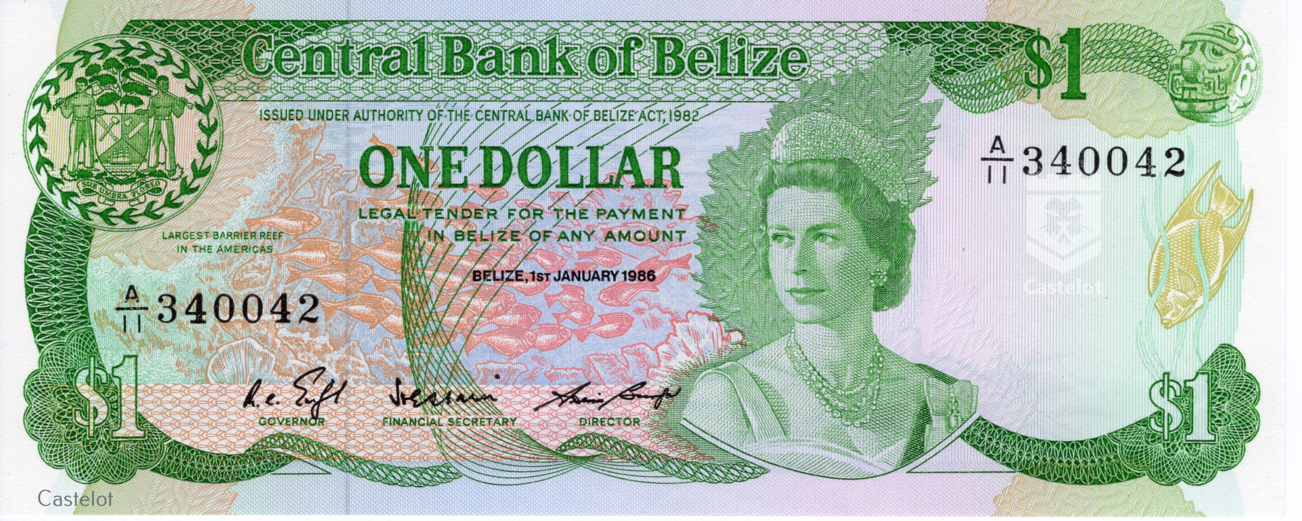 - Anverso/Cara: Escudo de Armas arriba a la izquierda. Gran barrera de Coral de Belice a la izquierda. Retrato Reina Isabel II en el centro Derecha.