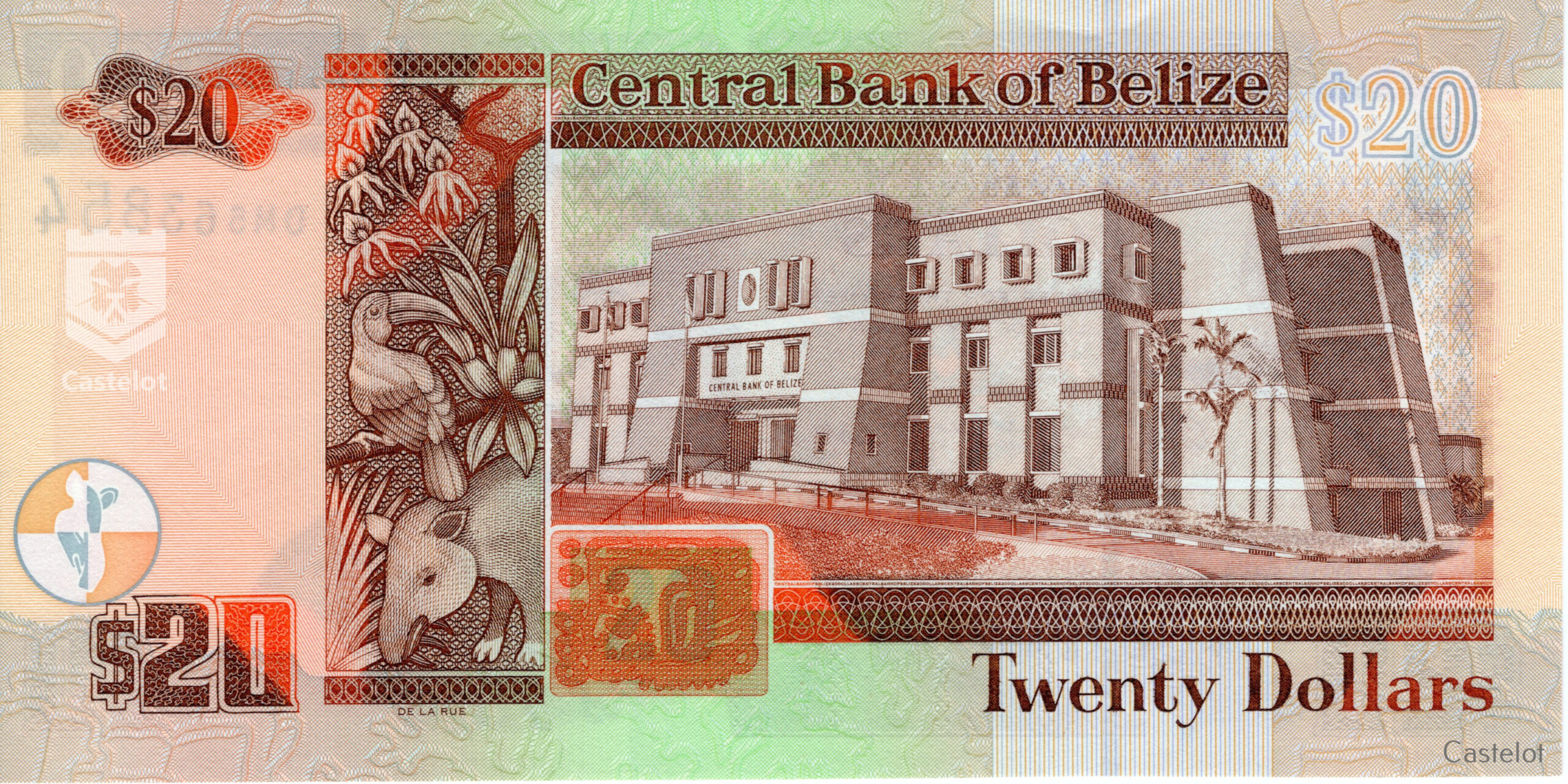 - Reverso/ dorso: Fauna y Flora (Tucán, tapir) y Edificio del Central Bank of Belize